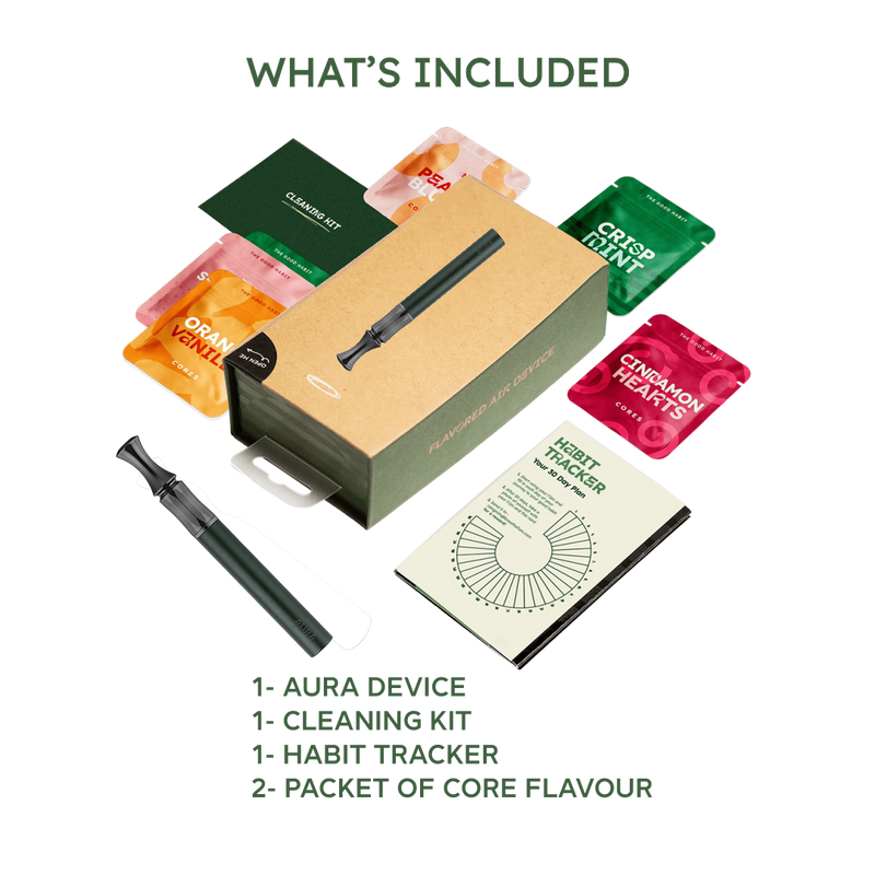Physiology shows stopping a bad habit cold turkey is very hard on your brain. Aura works by replacing your hand-to-mouth fixation, calming nervous tension through fidgeting, and distracting you from your bad habit with delicious flavor.