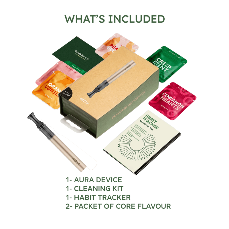 Physiology shows stopping a bad habit cold turkey is very hard on your brain. Aura works by replacing your hand-to-mouth fixation, calming nervous tension through fidgeting, and distracting you from your bad habit with delicious flavor.